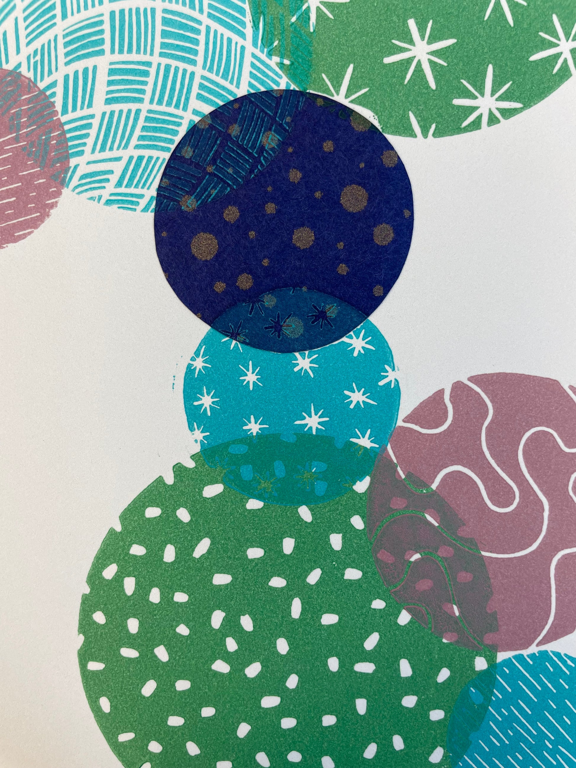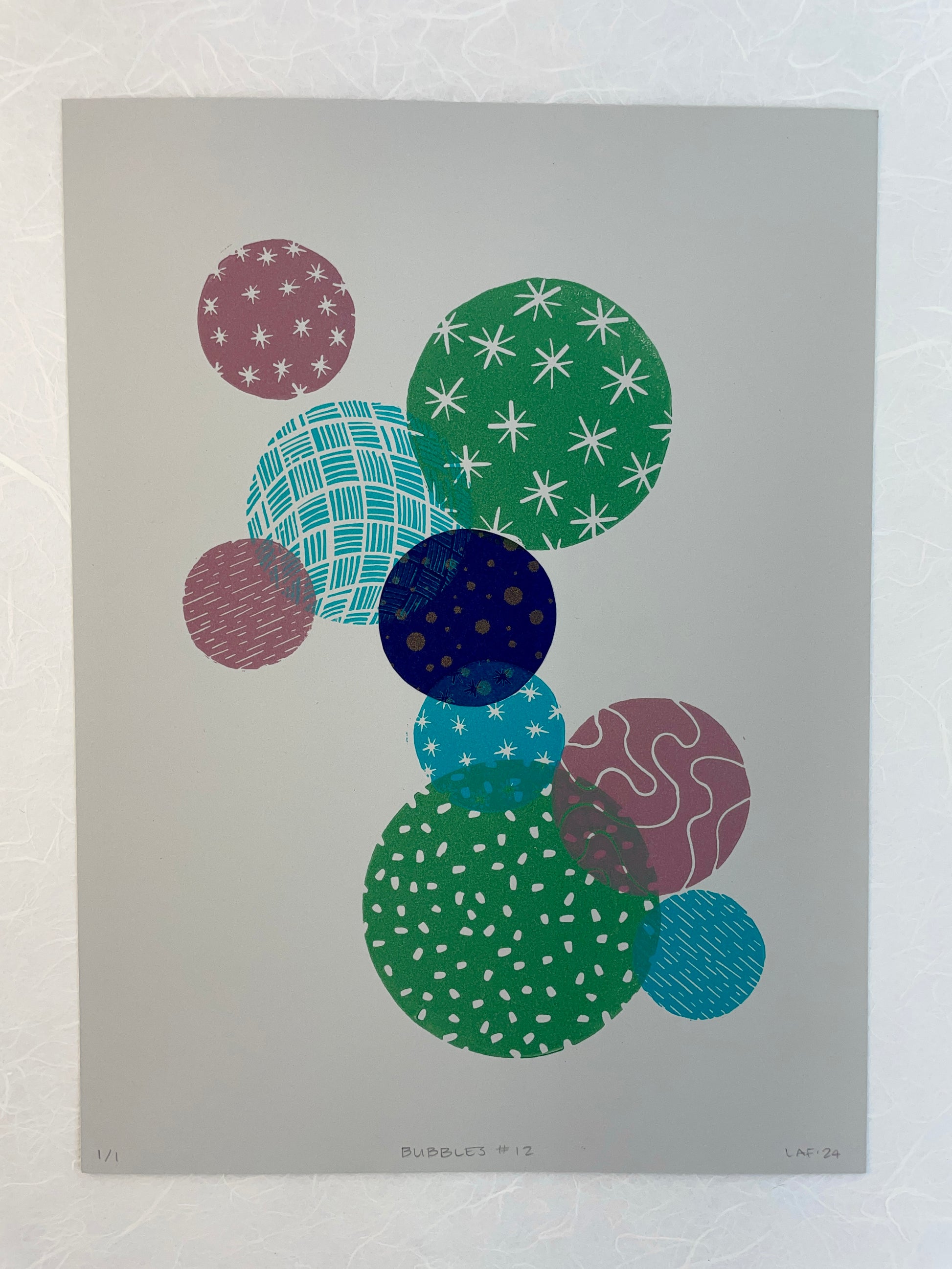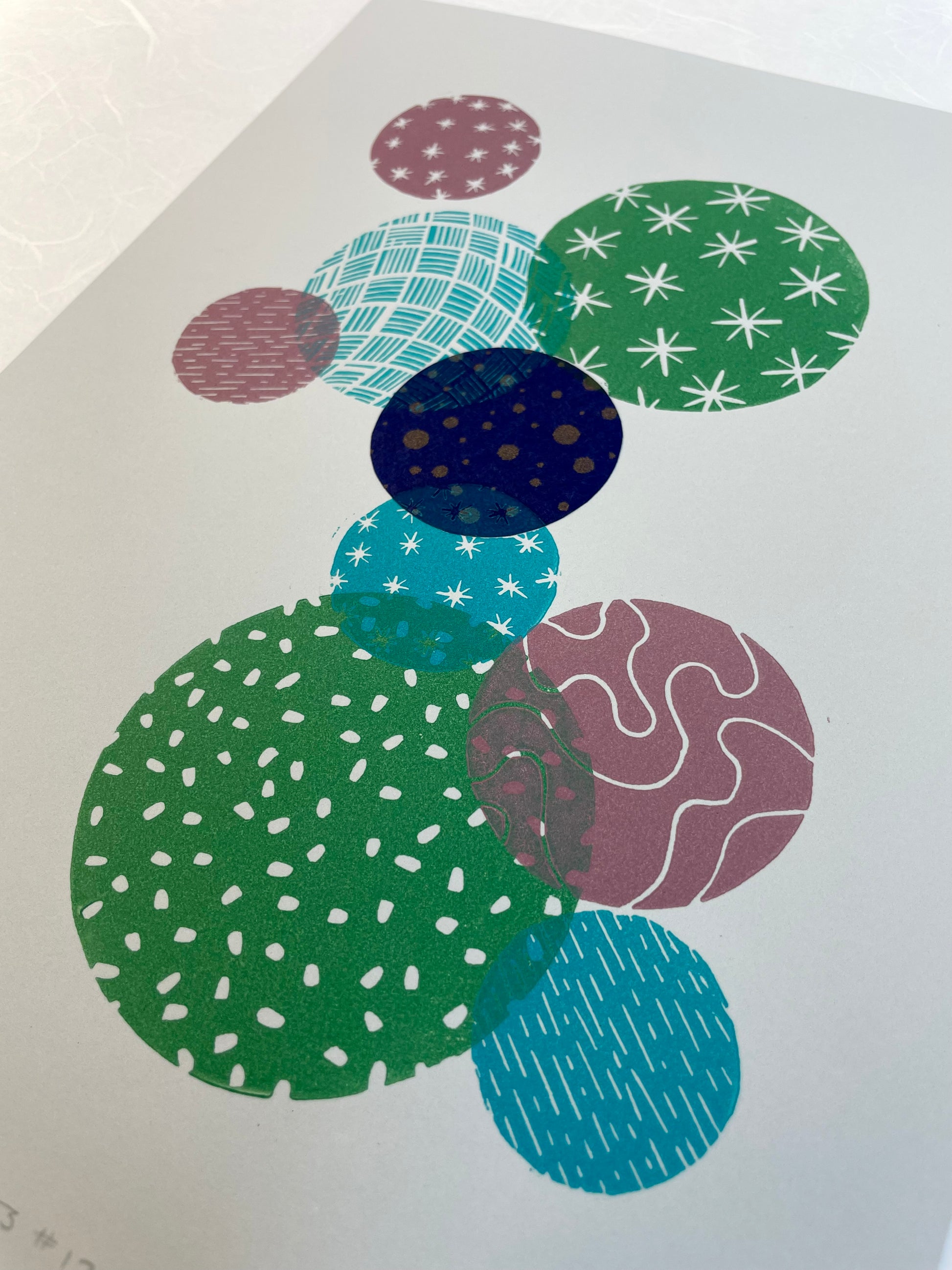 This hand-printed, multi-layered linocut print is part of my limited edition Bubbles series, where translucent colors and patterns overlap deliciously to create unique compositions. This piece also has an added touch of a chine-collé washi paper bubble.