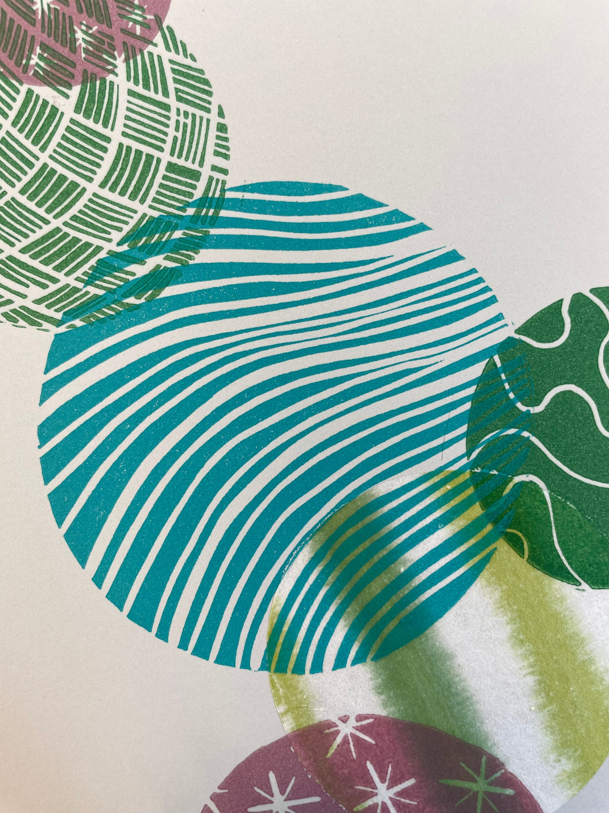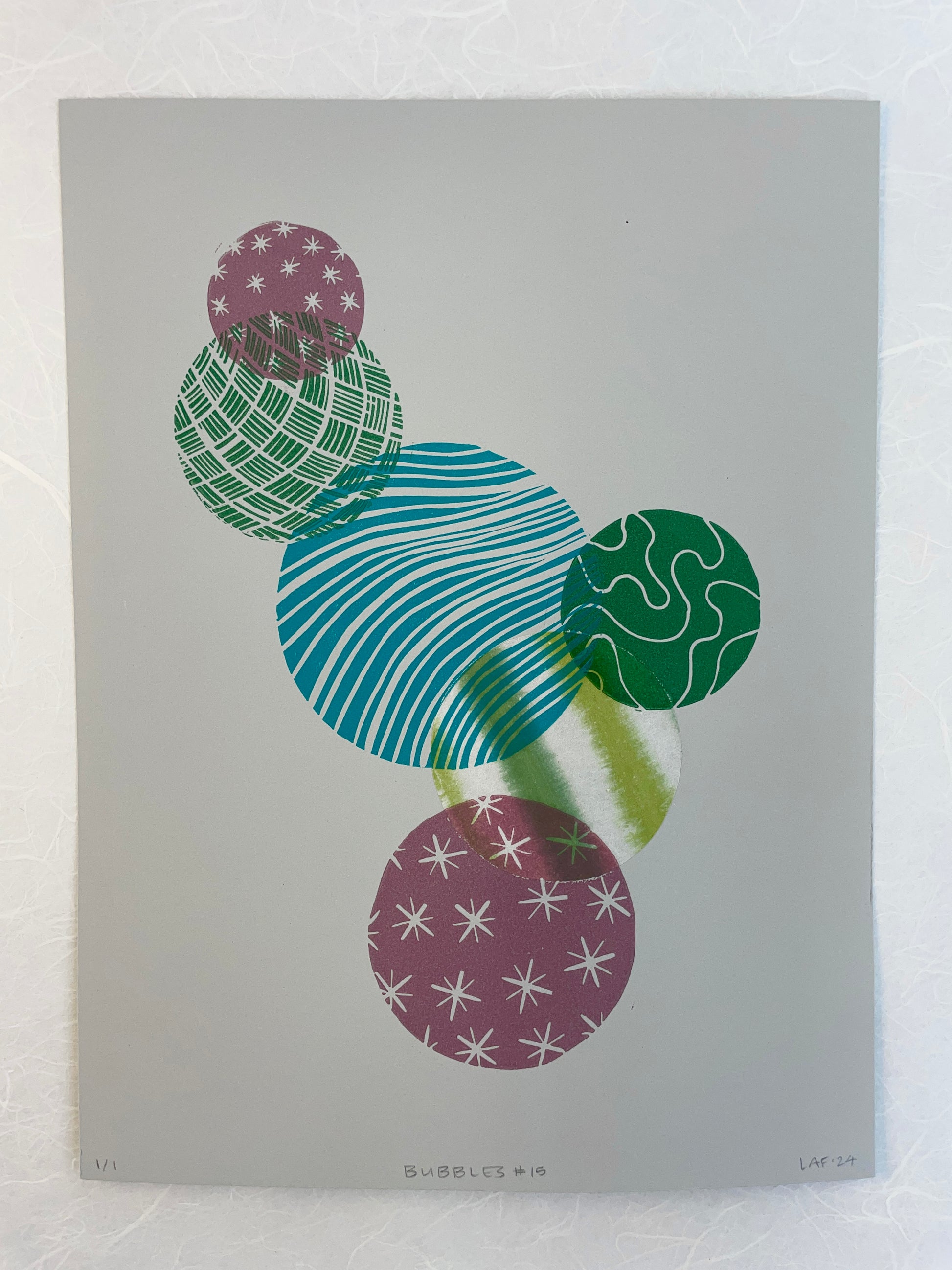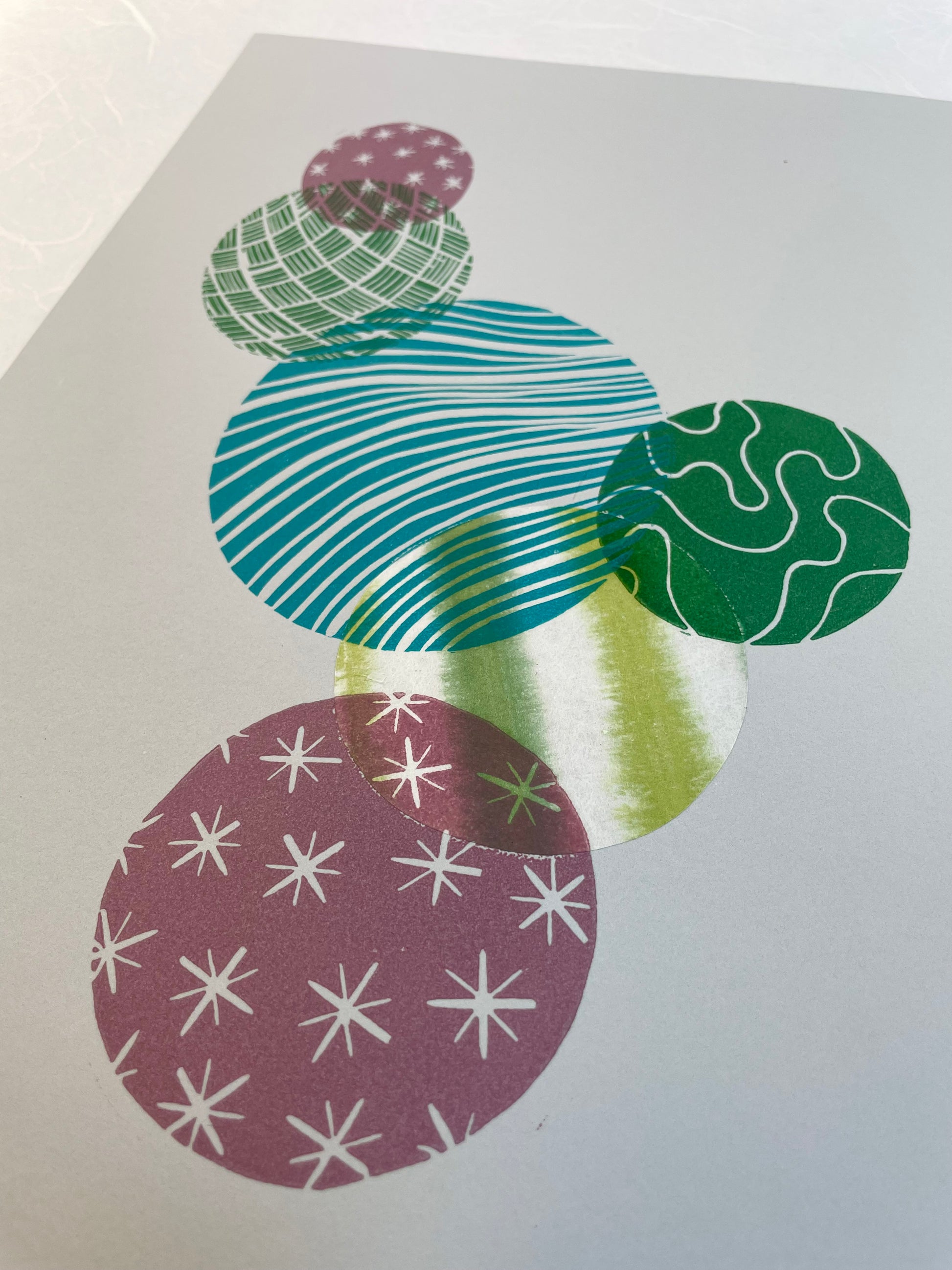 This hand-printed, multi-layered linocut print is part of my limited edition Bubbles series, where translucent colors and patterns overlap deliciously to create unique compositions. This piece also has an added touch of a chine-collé washi paper bubble.