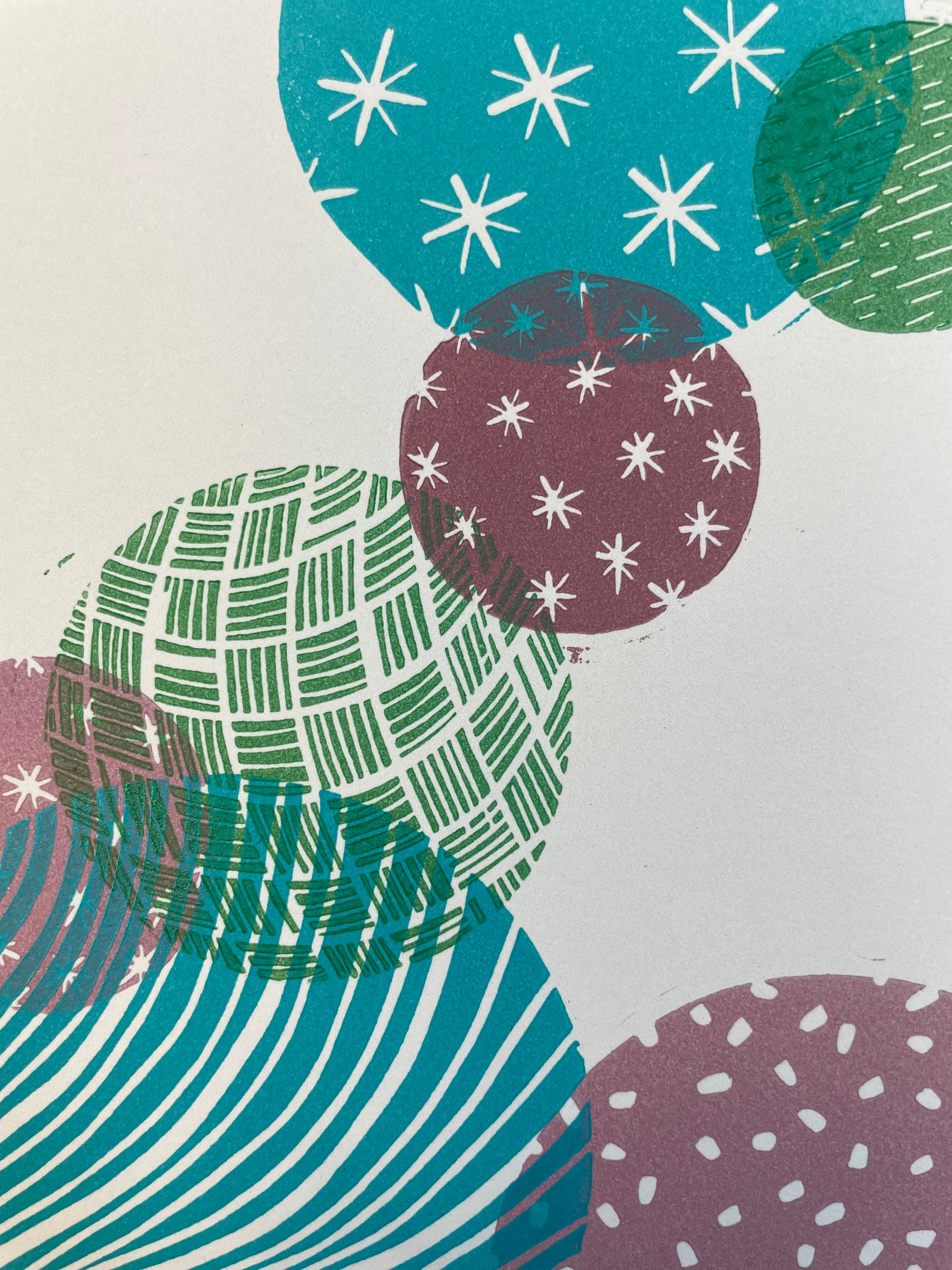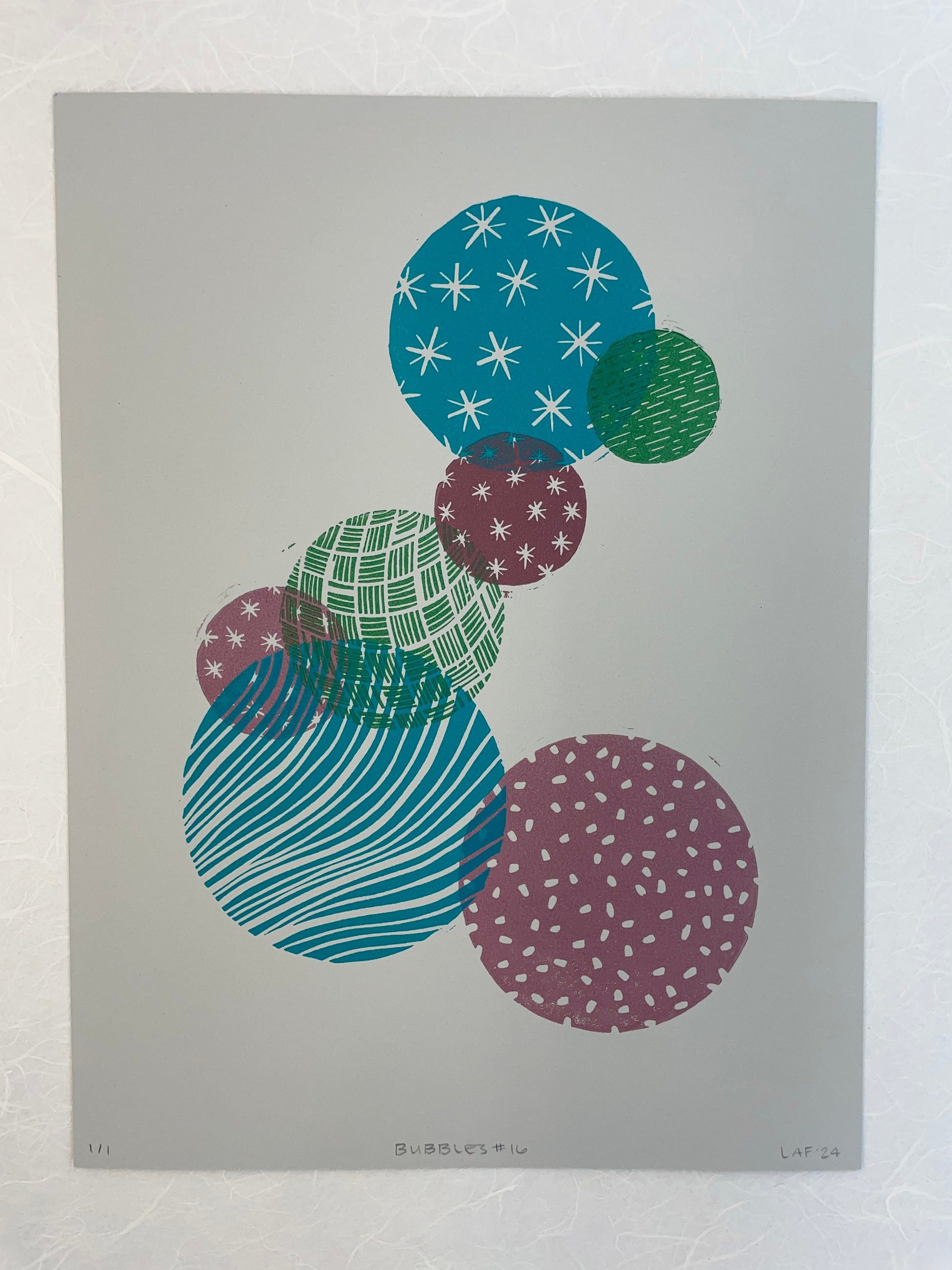 This hand-printed, multi-layered linocut print is part of my limited edition Bubbles series, where translucent colors and patterns overlap deliciously to create unique compositions.