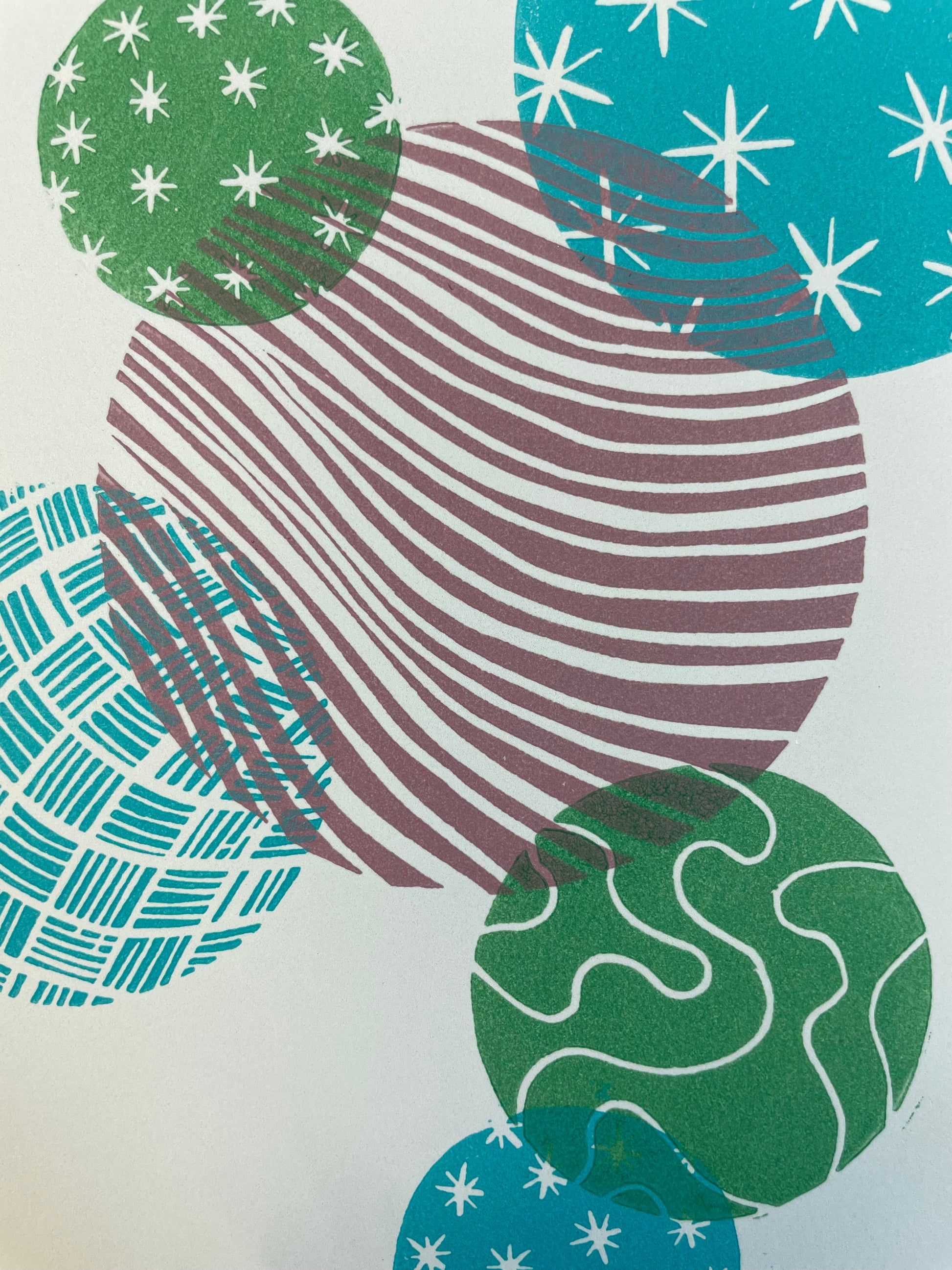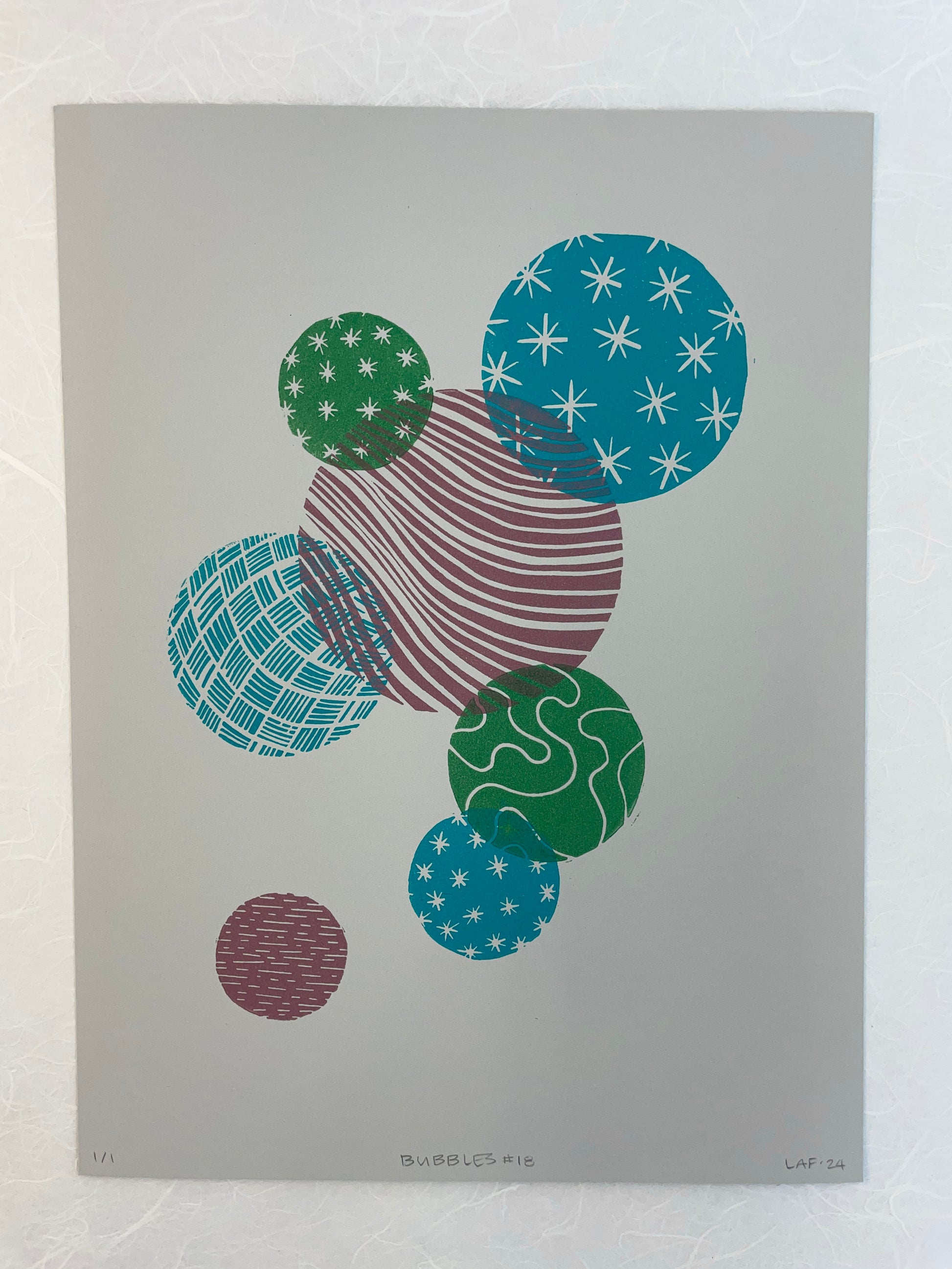 This hand-printed, multi-layered linocut print is part of my limited edition Bubbles series, where translucent colors and patterns overlap deliciously to create unique compositions.
