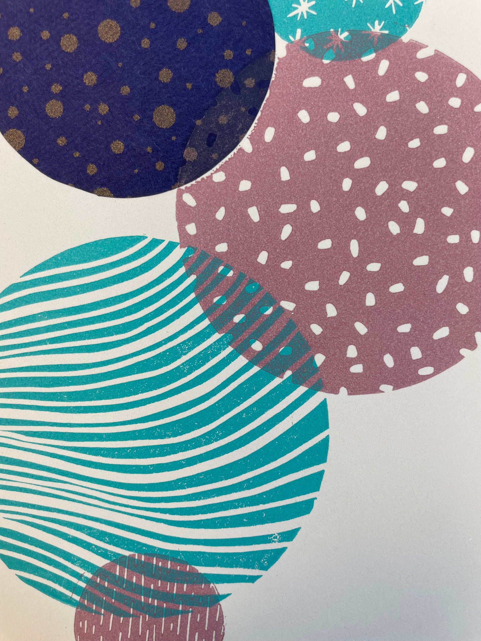 This hand-printed, multi-layered linocut print is part of my limited edition Bubbles series, where translucent colors and patterns overlap deliciously to create unique compositions. This piece also has an added touch of a chine-collé washi paper bubble.