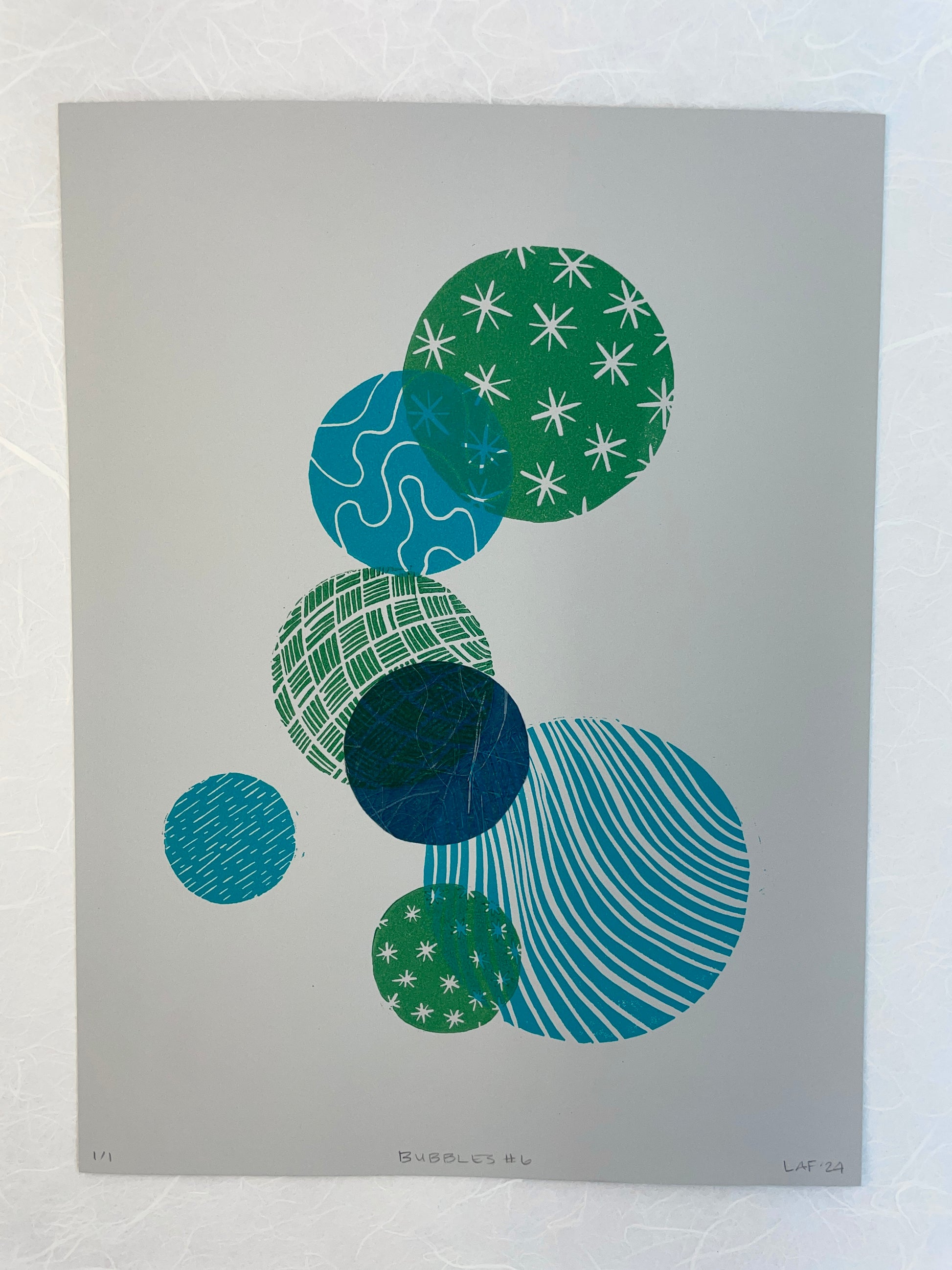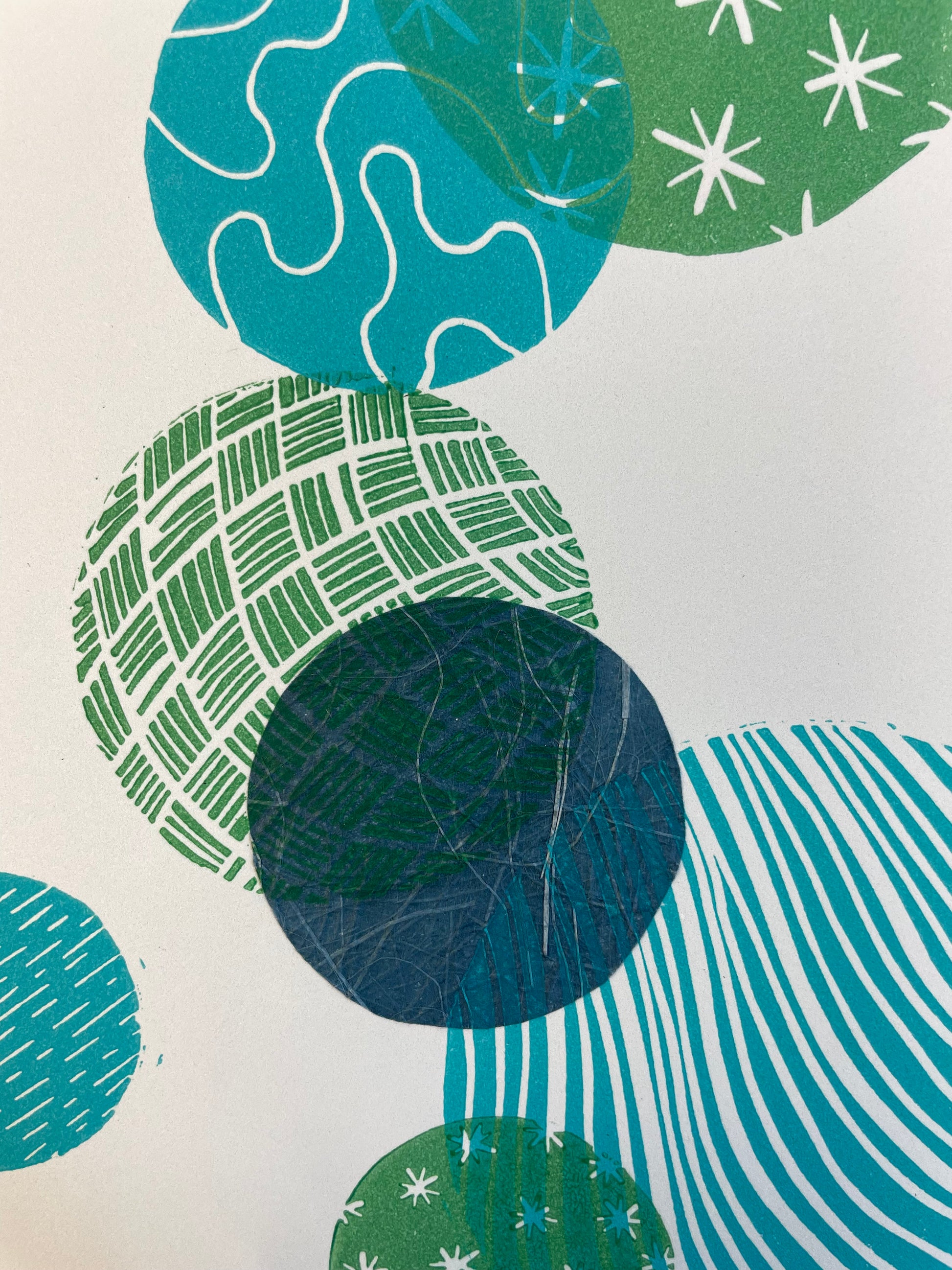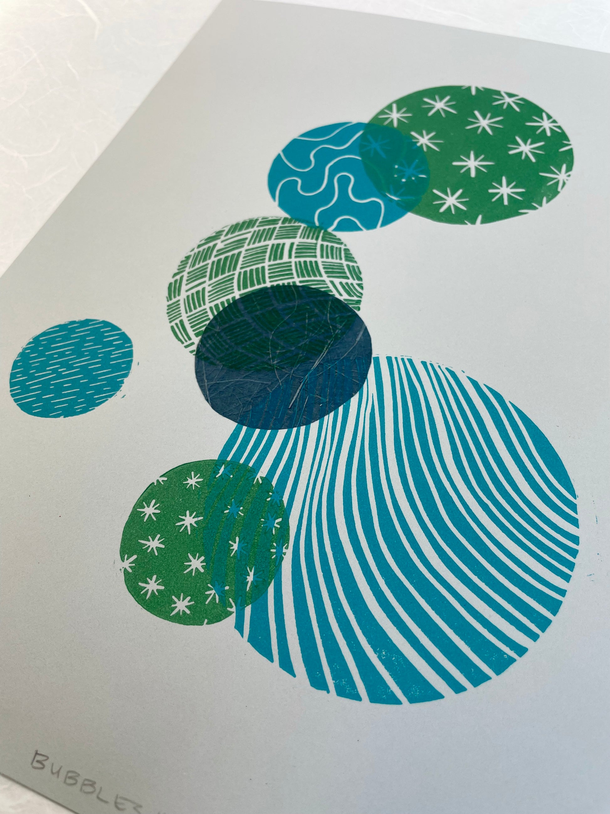 This hand-printed, multi-layered linocut print is part of my limited edition Bubbles series, where translucent colors and patterns overlap deliciously to create unique compositions. This piece also has an added touch of a chine-collé washi paper bubble.