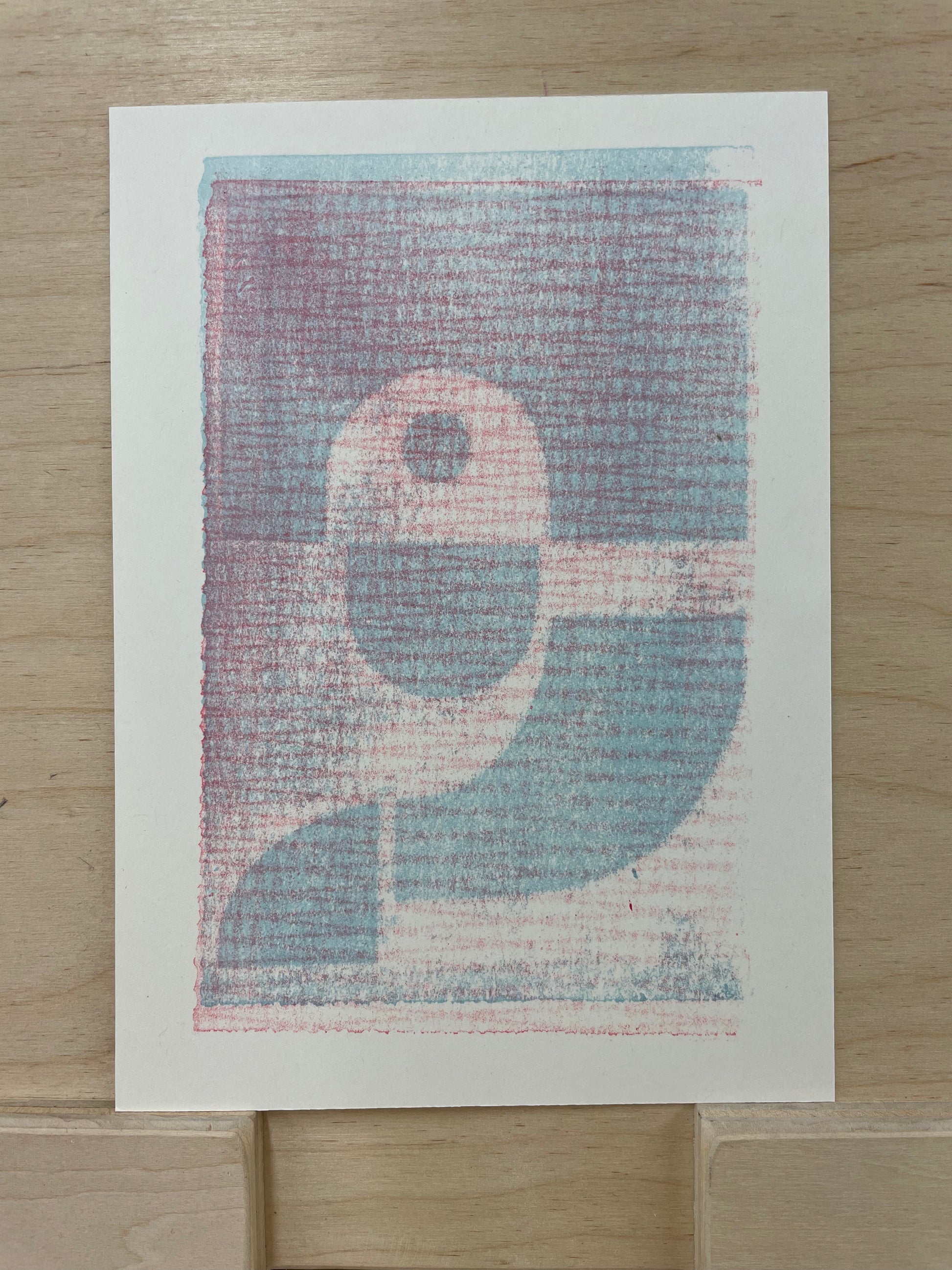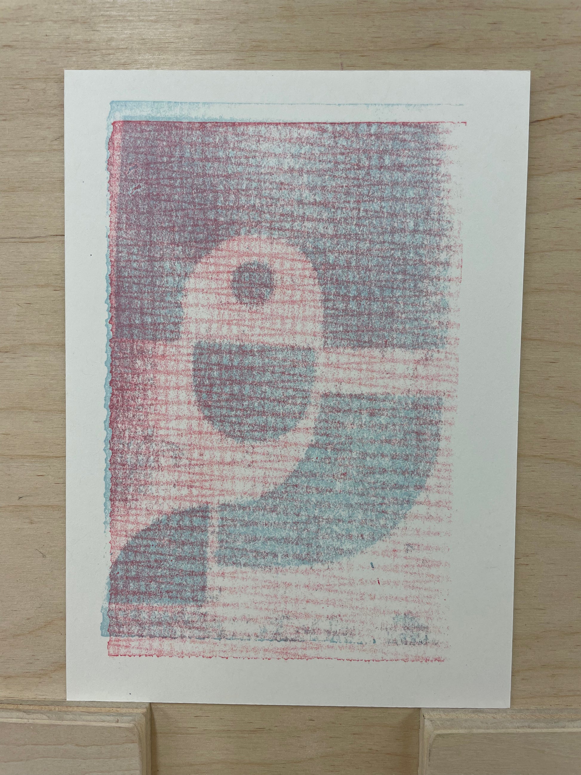 This print is approximately 6” x 8”, made with oil-based ink, and printed on off-white cardstock.